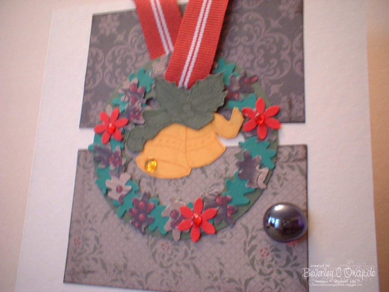 This is the third and last card the stampin' ladies made on Thursday evening...it's suppose to look like a door with a wreath hanging from it by ribbon...I would suggest if this card is to be mailed I wouldn't use the glass gem as a door knob...it is better to stamp a circle out of card stock...the glass gem makes it very heavy and possibly expensive to mail...the ladies did the sample with the glass gem and the rest they were going to mail had a card stock door knob...and it still looked fantastic...great job ladies.